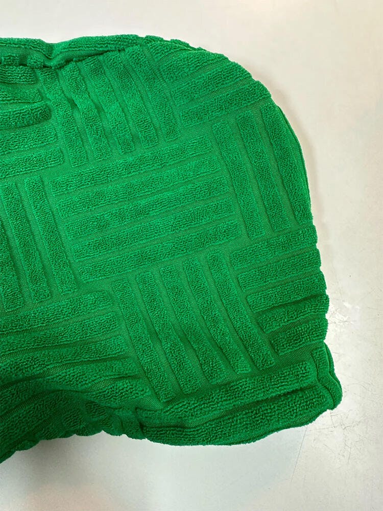 • Italian Aesthetic: A chic geometric pattern is woven into soft green terry. It reflects a cosmopolitan fashion perspective.